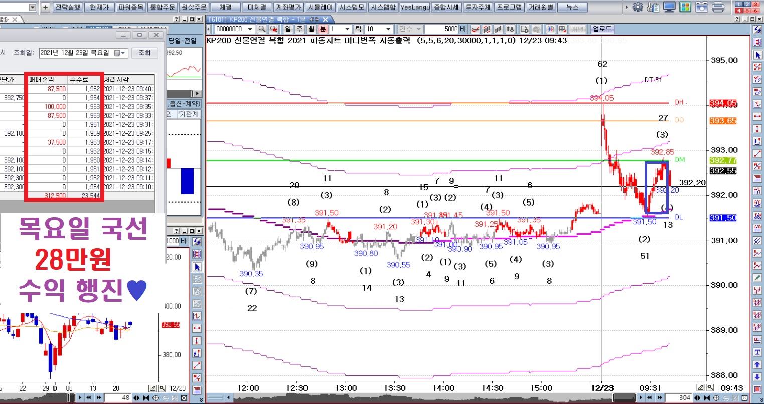 392.70 매수 - 392.25 / 392.00 1계약씩 물량 추가 - 392.45 1계약 청 - 392.45 1계약 또 익청 - 392.50 올청